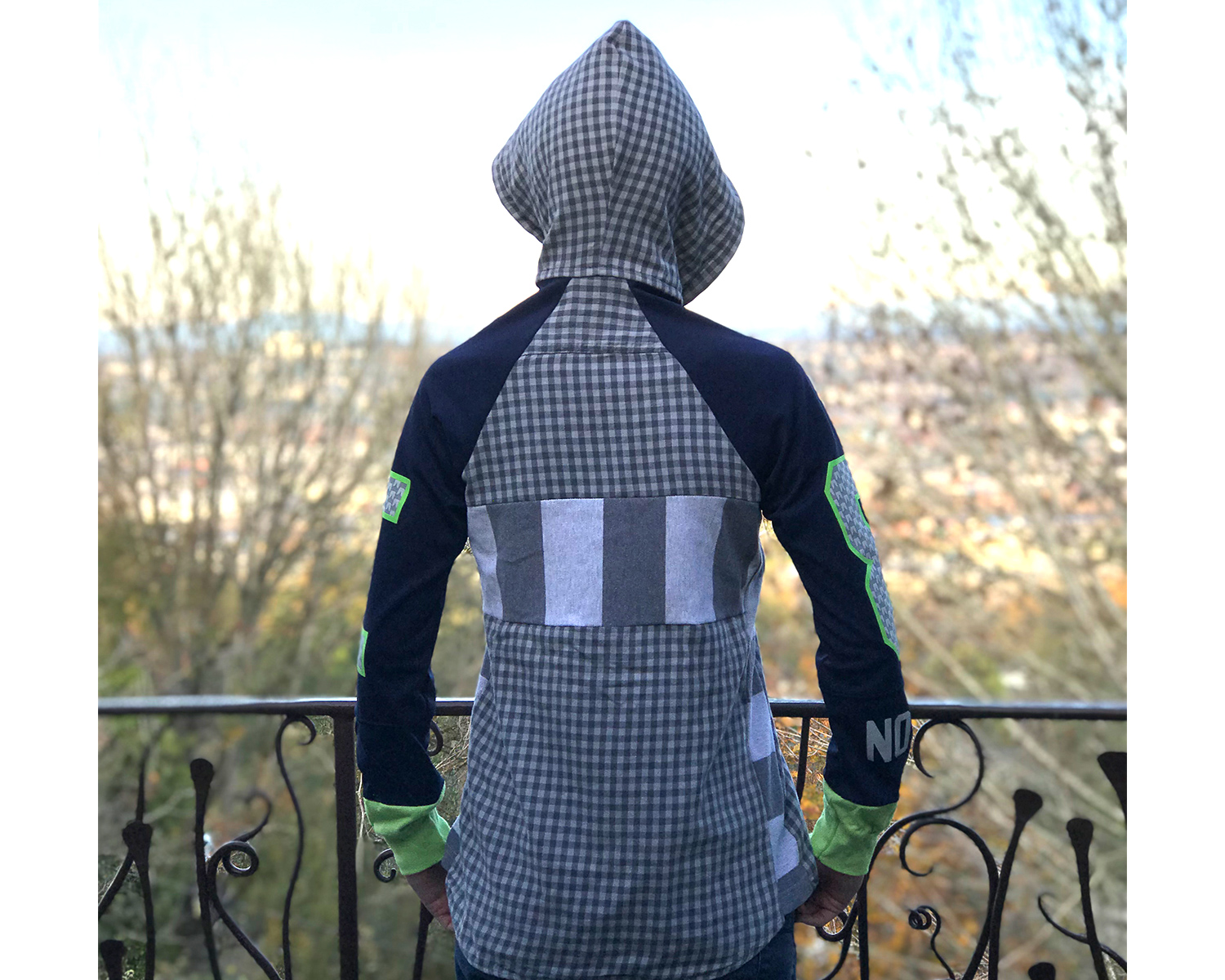 Introducing the Football Series Raglan Hoodie. Great for the fashionable Seahawks fan! Turn heads with this soft, comfy, lightweight button up shirt handmade with woven and knit fabric from four different premium garments. The sleeves came from an official Seattle Seahawks Russell Wilson fan jersey with a big bold 3 on each arm. The original v-neck of the jersey falls on the left wrist, with “Wilson” on the right wrist. The hood is very voluminous and lined with soft cotton. Side panels offer movement and added style. Reflective paracord drawstring.
